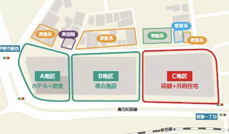 商店街に面しており、A 地区 ( 三交インホテル ) 、B 地区 ( 伊勢市健康福祉ステーション・ハローワーク・三交インホテル ( 別館 ) ・賃貸住宅 )となっています。